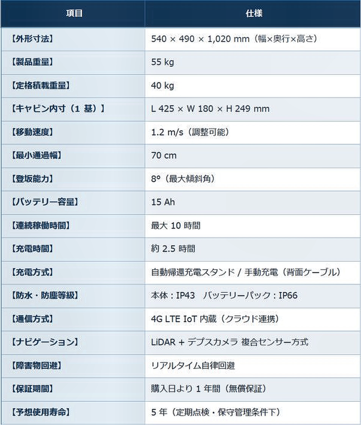 - 完全自律走行 — 自律的なルート計画・精確なナビゲーション・リアルタイム障害物回避を実現。人手を介さず安全に目的地まで到達します。
